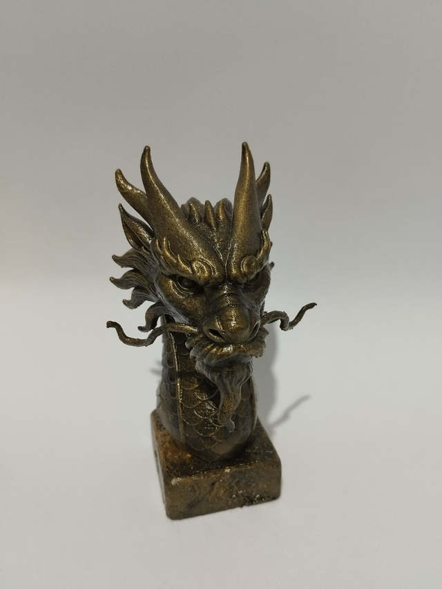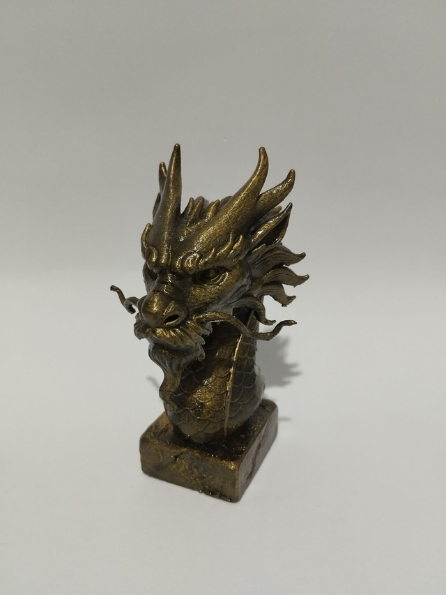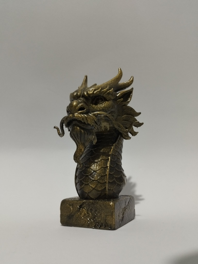 Representado com bigode longo, chifres curvos e escamas detalhadas, este busto simboliza sabedoria, proteção e poder espiritual.